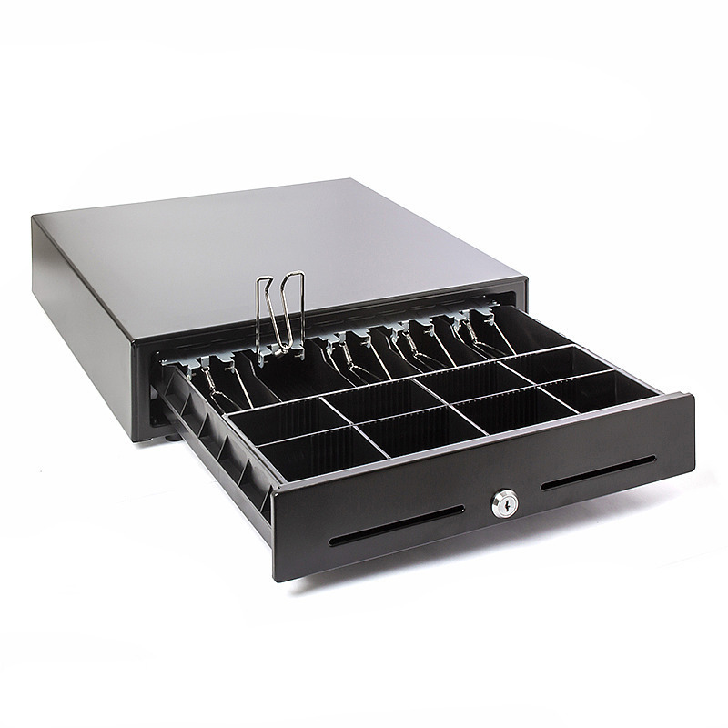Стильный эргономичный дизайн – чёрный металлический корпус и крышка из нержавеющей стали. Надёжная система хранения: внутренний лоток вынимается и имеет собственную крышку с механическим замком, шесть вертикальных отделений для банкнот и восемь – для монет. Ширину ячеек для купюр можно регулировать до необходимого размера. Наличие отдельной крышки внутреннего лотка позволяет обеспечивать работу сменных кассиров.